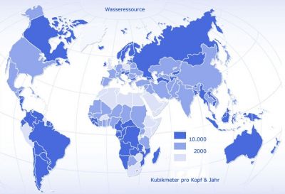 Der Wasserbedarf ist in den letzten 300 Jahren um etwa das 35-fache gestiegen. Der Grund dafür ist, dass die Weltbevölkerung in diesem Zeitraum von weniger als einer Milliarde auf derzeit rund 6,7 Milliarden drastisch zugenommen hat. Der Verbrauch ist in den Haushalten Nord- und Mittelamerikas mit 300 Litern täglich doppelt so hoch wie in Europa mit etwa 150 Litern und viel, viel höher als in Afrika mit 20 Litern pro Tag. Weltweit leiden derzeit etwa 30 Länder unter Wassermangel. In den nächsten drei Jahrzehnten werden noch weitere 40 dazukommen.