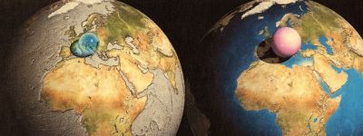 Die Darstellung zeigt, wie groß eine Kugel wäre, die alles Wasser der Erde - 1,4 Milliarden Kubikkilometer - enthielte. Die blaue Kugel enthält alles Wasser der Erde: aus den Meeren, den Böden, aus Flüssen, Gletschern und Seen. Die rosa Kugel enthält alle Luft bis in mehr als 1000 Kilometer Höhe. Diese Darstellung veranschaulicht, wie kostbar die beiden Ressourcen sind. Tatsächlich besteht der blaue Planet nur zu einem Tausendstel aus Wasser.