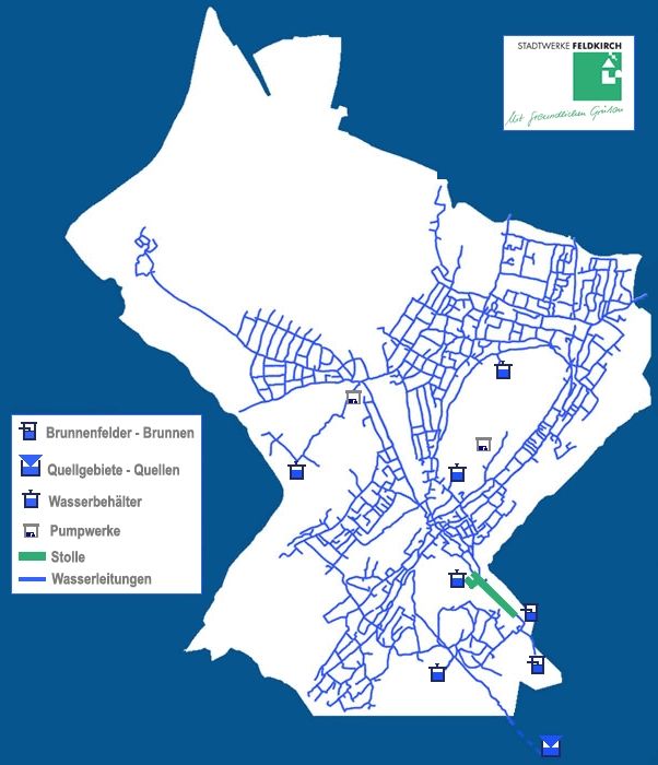 Die Wasserentnahme erfolgt aus drei Quellen und vier Tiefbrunnen. Um Bedarfsspitzen abzudecken stehen 6 Wasserbehälter mit einem gesamten Speichervolumen von über 10.000 Kubikmeter zur Verfügung. Das Versorgungsgebiet (siehe oben) des Wasserwerkes umfasst eine Fläche von über 34 km². Im öffentlichen Versorgungsgebiet besteht Anschlusszwang.